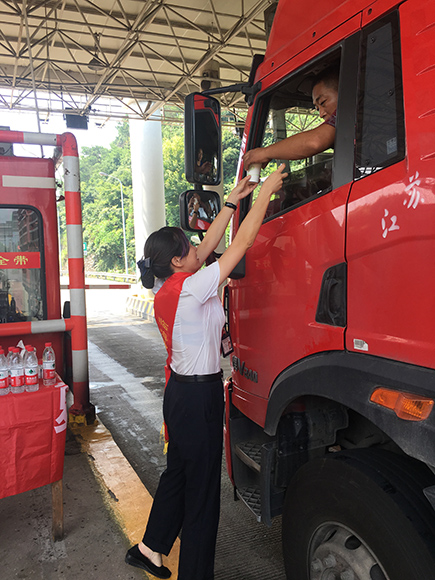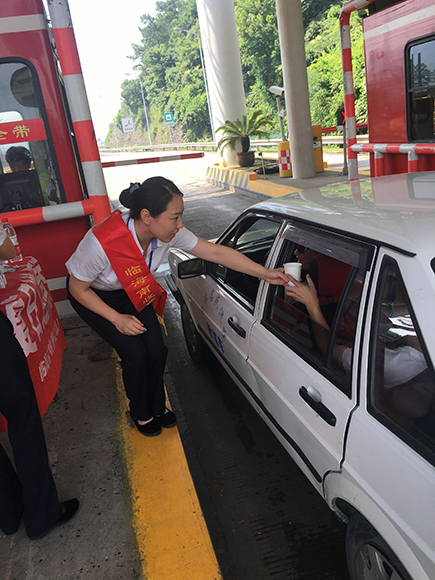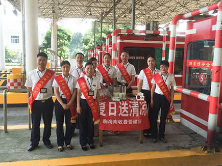 圖為工作人員合影 活動當(dāng)天,該所在車道安全島內(nèi)搭起臨時“便民服務(wù)臺”,不僅免費為司乘人員提供綠豆湯、礦泉水等消暑食品,還備足藿香正氣水、風(fēng)油精、清涼油、花露水等解暑降溫藥品?;顒又校蠹疑砼麢M幅,面帶微笑,向途經(jīng)收費所的司機遞上一杯杯綠豆湯、一瓶瓶礦泉水。同時,大家還不忘宣傳行車安全注意事項,提醒司機朋友在高溫酷暑時節(jié)多注意安全。司機朋友們不時露出欣喜的笑容,連連稱謝。 臨海南收費所通過開展“夏日送清涼”活動,不僅給廣大司乘人員在酷暑中送去絲絲涼意和關(guān)心,更加促進了收費員與司乘人員之間的溝通交流,拉近距離,從而贏得了過往司乘人員的好評,塑造了良好的窗口形象。 陳瑩