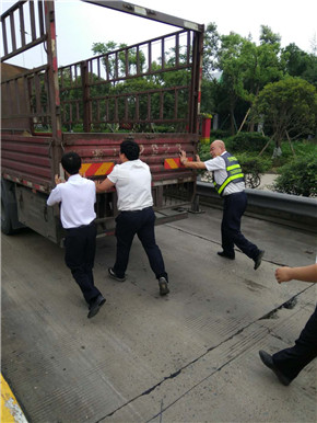 2018年5月27日,這本來是平凡普通的一天,可因為這件事,變成了不一樣的一天。 這一天,溫嶺西高速路收費員洪燈杰像往常一樣,在一號超寬車道旁的收費亭里工作。一輛綠色汽車剛走不久,卻發現后面一輛12軸型的小貨車停在那里,一動不動。洪燈杰心生疑惑,于是趕緊走出收費亭,到小貨車跟前查看。原來,這輛車剛走到收費站面前,便耗盡了電量,發動不了了。正在司機焦頭爛額之時,班長湯明漲和其他收費員吃飯回來,看見了這一幕。 湯明漲簡單地詢問了洪燈杰事情的經過,本來準備等拖車,可是現在正是中午車輛高峰期,加上五號車道在施工,等拖車不合適。如果導致一號車道堵車,切換成ETC也緩解不了。考慮到這些問題之后,湯班長決定叫來幾個“大力士”,幫忙推車。