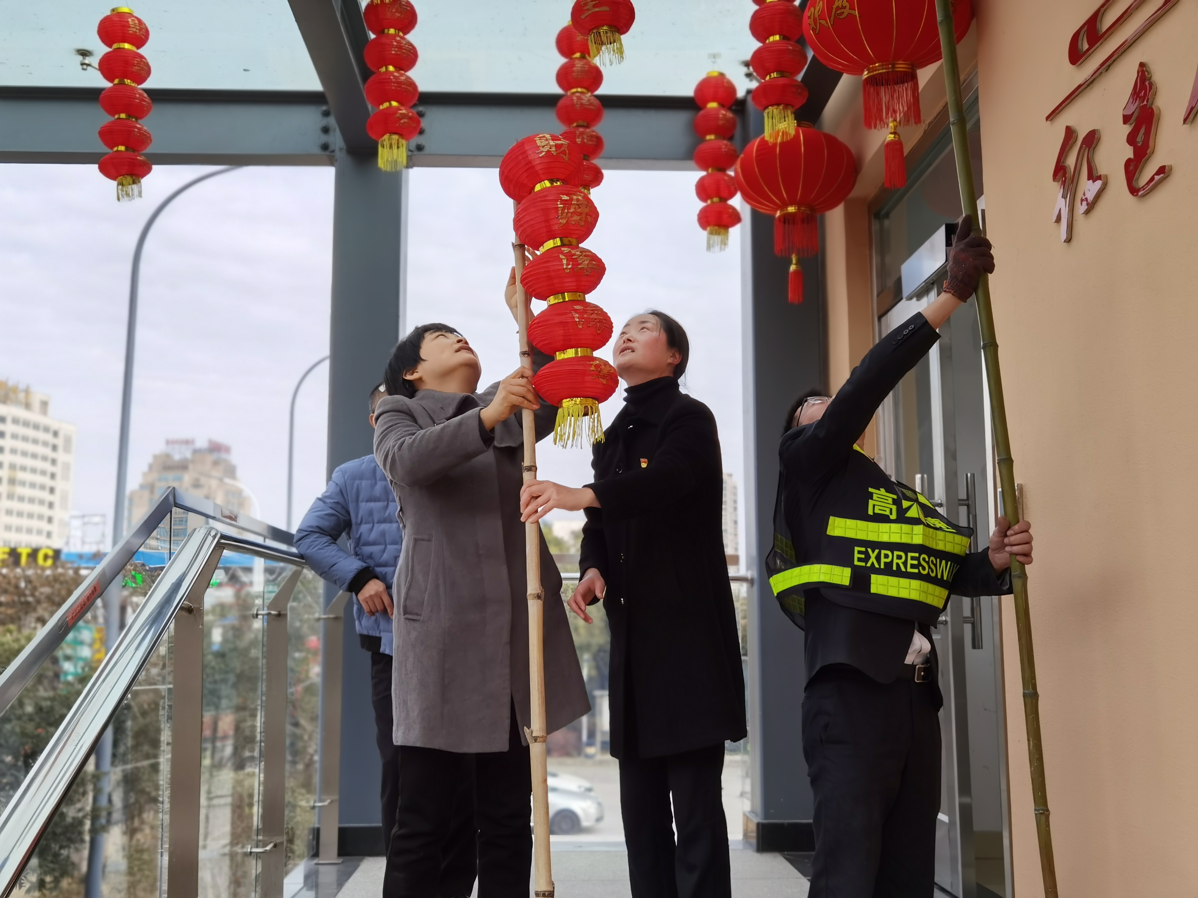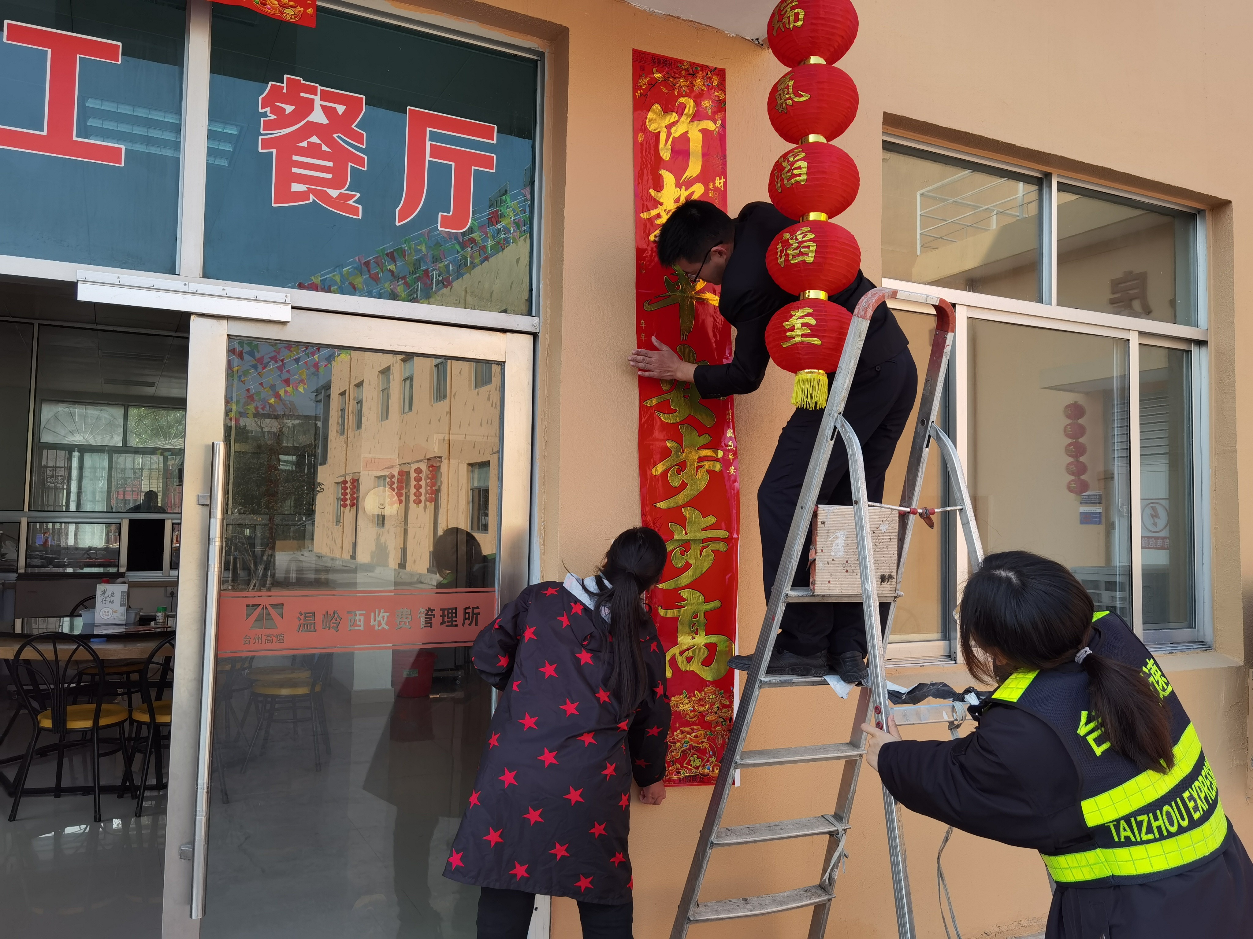 大家分工合作,搬梯子、遞春聯、貼膠帶、校正高低。在站所內每個角落都掛上了紅彤彤的燈籠;收費區域內廣場兩邊的欄桿上扎著一面面彩旗。一幅幅精致喜慶的對聯、“福”字,一串串三角彩旗,一個個大紅燈籠把整個收費站所點綴得處處洋溢著濃厚的節日氛圍,“年味”十足,讓在站員工和過往司乘朋友感受到新年的喜慶氛圍和“家”的溫暖。