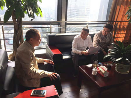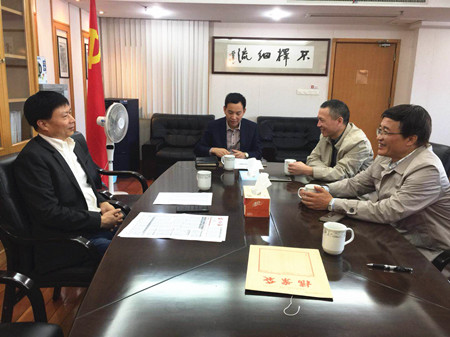 圖為市國資委主任徐豪和集團(tuán)總經(jīng)理張建平一起走訪市財政局股東單位