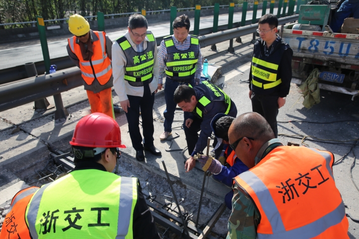 隨后,在伸縮縫型鋼安裝現(xiàn)場(chǎng),陳文波撿起鑿除的碎渣,查看被鑿除的舊伸縮縫情況。公司所轄路段屬于軟土路基,且有91座橋梁,由于運(yùn)行時(shí)間已20余年,部分橋梁伸縮縫破損較為嚴(yán)重,如何維修橋梁伸縮縫和橋頭跳一直是個(gè)老大難問題。在橋梁伸縮縫修補(bǔ)現(xiàn)場(chǎng),因?yàn)橹剀嚨哪雺海糠稚炜s縫已經(jīng)磨損嚴(yán)重,所在的混凝土路面只能借助鑿巖機(jī)進(jìn)行作業(yè)。