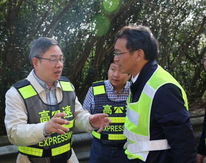 10月31日上午,臺(tái)州高速集團(tuán)董事長(zhǎng)陳文波在總工程師江輝的陪同下,趕赴甬臺(tái)溫高速公路溫州方向黃土嶺隧道、橋梁維修加固工程施工現(xiàn)場(chǎng),檢查施工進(jìn)展情況。