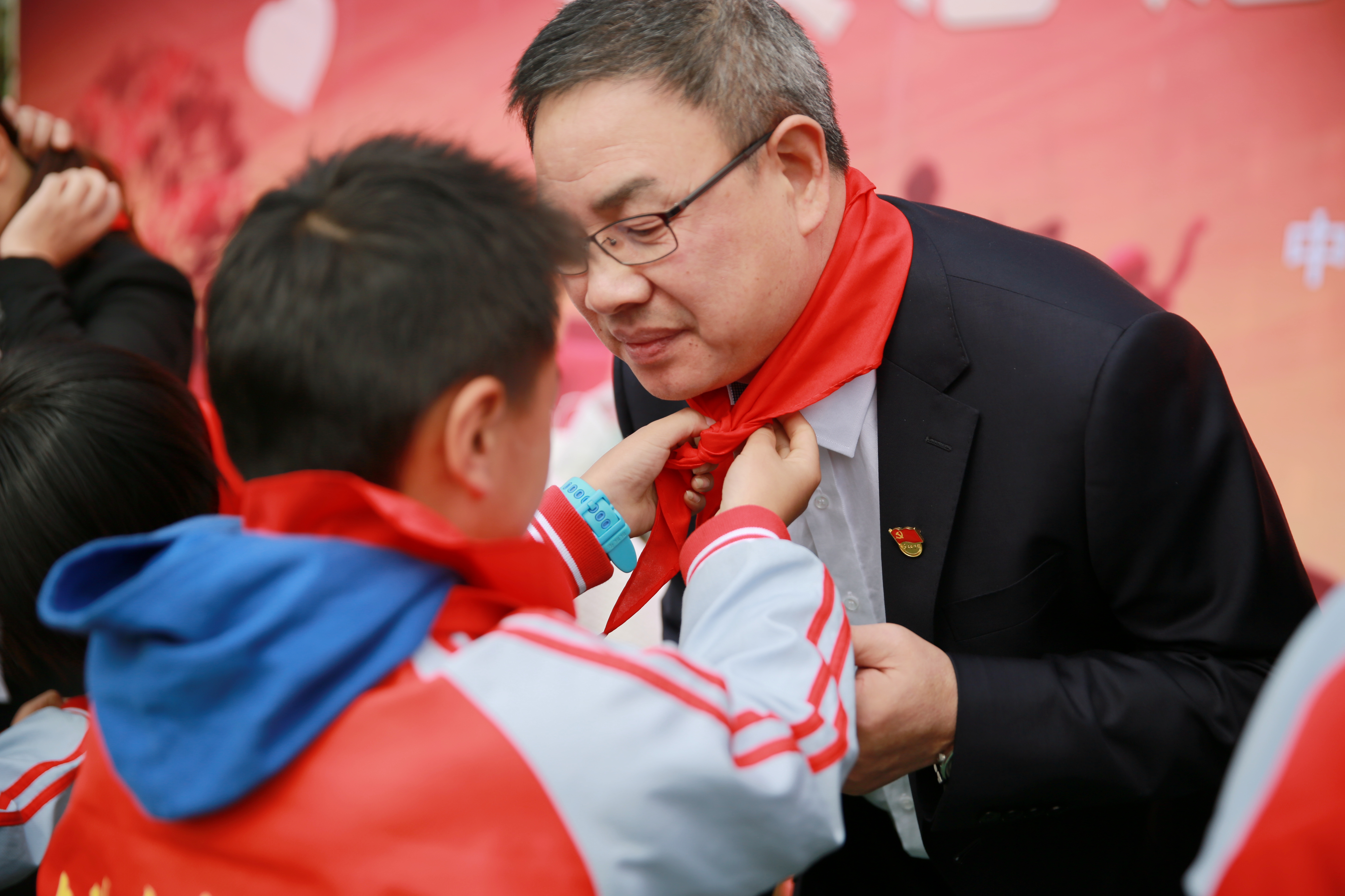 在“點亮微心愿”環節,臺州高速集團領導班子們為學生代表送上新衣服、學習用品等,孩子們則為志愿者叔叔阿姨們系上了在他們眼中最珍貴的紅領巾。