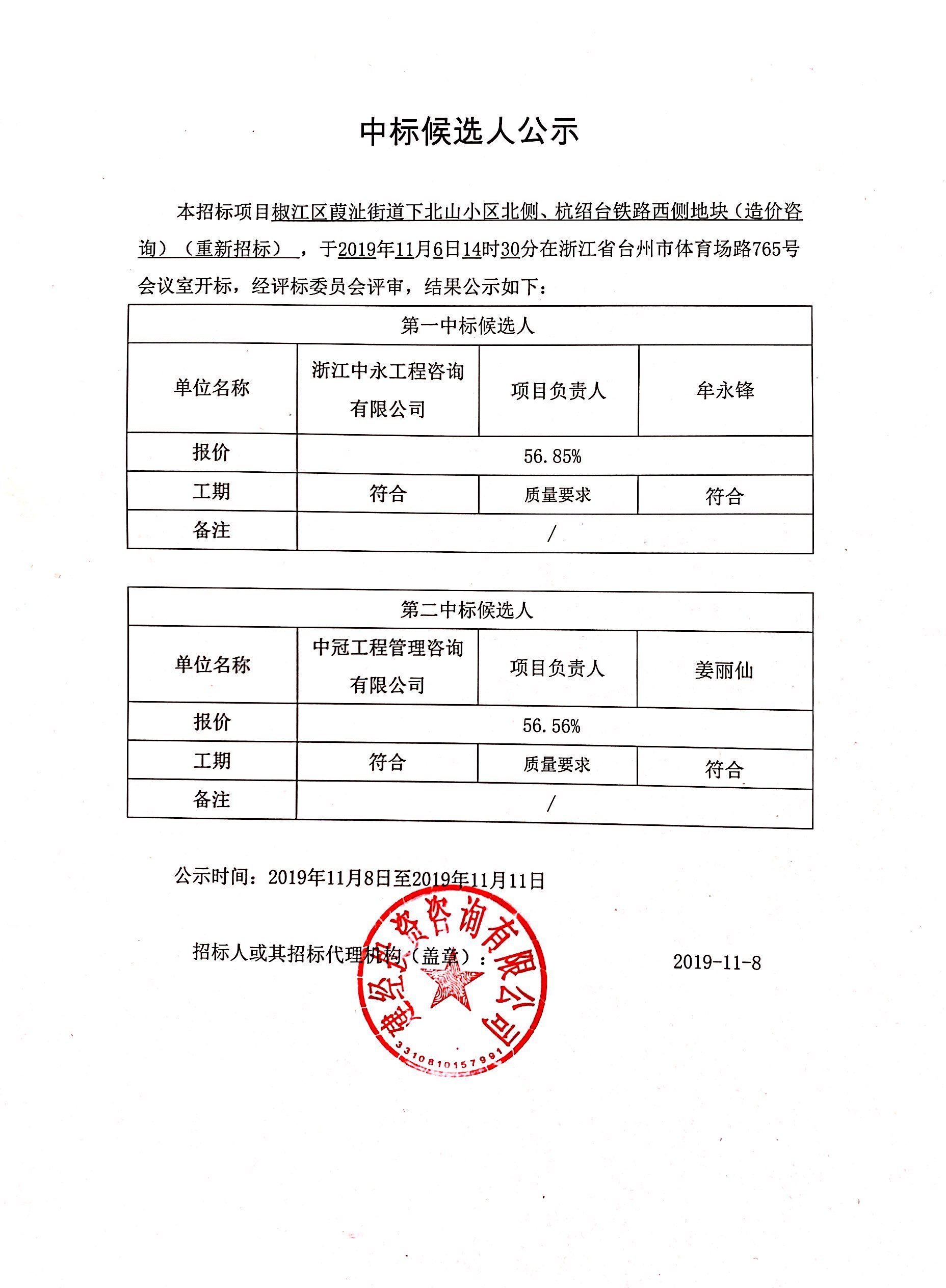 椒江區(qū)葭沚街道下北山小區(qū)北側、杭紹臺鐵路西側地塊(造價咨詢)中標候選人公示