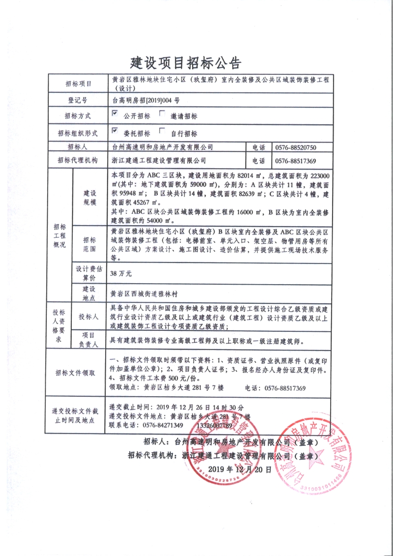 黃巖區(qū)雅林地塊住宅小區(qū)(玖璽府)室內(nèi)全裝修及公共區(qū)域裝飾裝修工程招標(biāo)公告