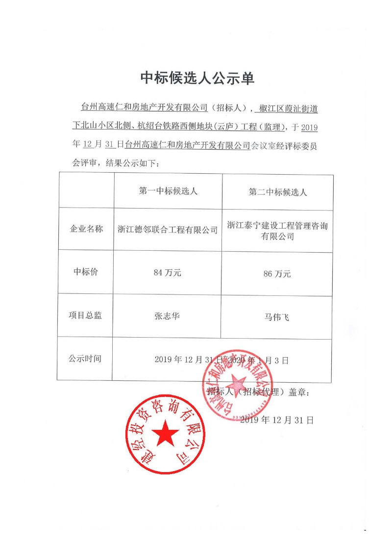 椒江區(qū)葭沚街道下北山小區(qū)北側(cè)、杭紹臺鐵路西側(cè)地塊(云廬)工程(監(jiān)理)中標(biāo)候選人公示單