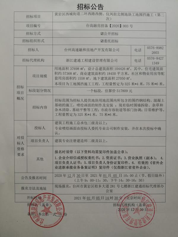 黃巖區西城街道二環西路西側、儀風街北側地塊工地圍擋施工(第二次)招標公告