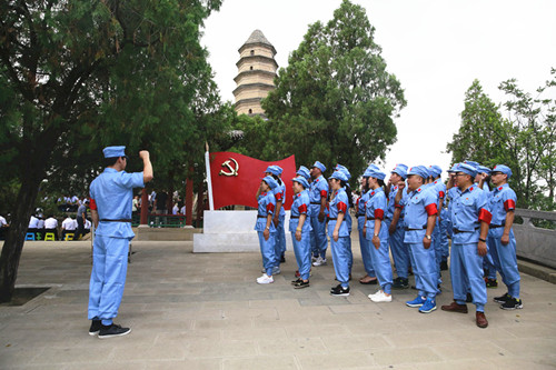 圖為黨員在梁家河合影 不顧前一天的舟車勞頓,第二天一大早,黨員們整裝出發(fā),在紅色旗幟引領(lǐng)下,頂著烈日,一路步行到達(dá)寶塔山山頂。“手抓黃土我不放,緊緊兒貼在心窩上。幾回回夢里回延安,雙手摟定寶塔山。”綜合支部的小周對(duì)著寶塔山,情不自禁地大聲誦讀起賀敬之的《回延安》。黨員們在巍巍寶塔下高舉右拳,用鏗鏘有力的聲音宣讀了入黨誓詞,對(duì)于大家來說,重溫入黨誓詞是共產(chǎn)黨員表達(dá)自己為共產(chǎn)主義奮斗終生的最佳方式,黨員們的心靈再次受到震撼和洗禮。